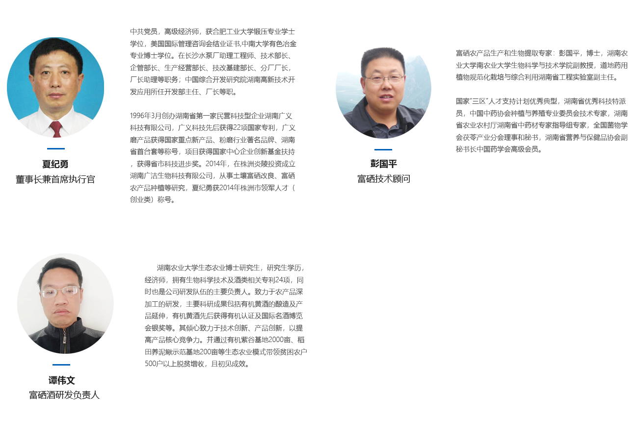 湖南廣潔生物科技有限公司是一家專業(yè)從事富硒產(chǎn)業(yè)科研、產(chǎn)品開發(fā)、生物提取等的生物科技公司,是湖南省富硒產(chǎn)業(yè)協(xié)會的會員單位。公司核心科研專家來自中南大學(xué)、湖南農(nóng)業(yè)大學(xué)、長沙學(xué)院、湖南安全職業(yè)技術(shù)學(xué)院等高校的博士團隊。公司的核心技術(shù)是農(nóng)作物的富硒種植,即在72%缺硒的土地上,針對缺硒、貧硒土壤、農(nóng)作物種植的不同要求進行針對性研究,施加不同配比的富硒土壤改良劑,減少農(nóng)作物重金屬含量,可以生產(chǎn)高有機硒含量的農(nóng)產(chǎn)品,尤其在稻谷種植方面取得了增產(chǎn)10-15%,降鎘50%以上的顯著效果。